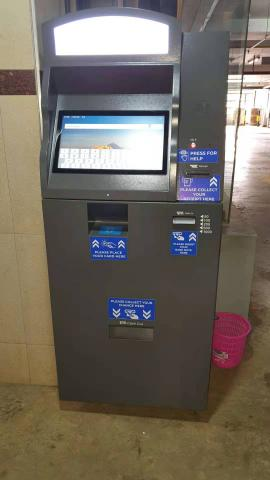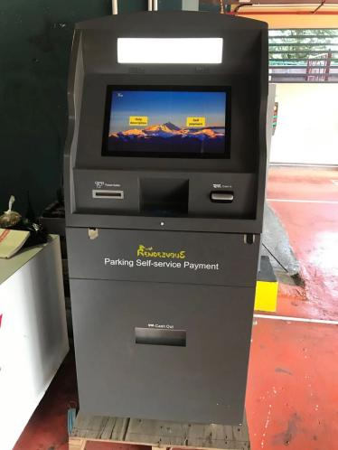 يمكن لهذه الآلة الدفع الذاتي التحقق من مبلغ الدفع عن طريق إدخال رقم لوحة الترخيص أو مسح رمز QR (تذكرة موقف السيارات) أو مسح بطاقة موقف السيارات.