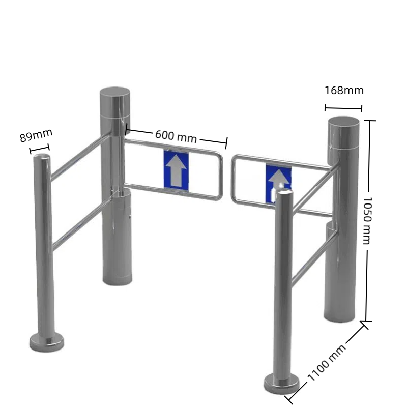 La nostra dimensione standard del cancello del tornello oscillante è 168mm (lunghezza) x 168mm (larghezza) x 1050mm (altezza) che esclude la lunghezza della colonna e pesa circa 35kg. Dimensioni personalizzate possono essere fatte su richiesta.