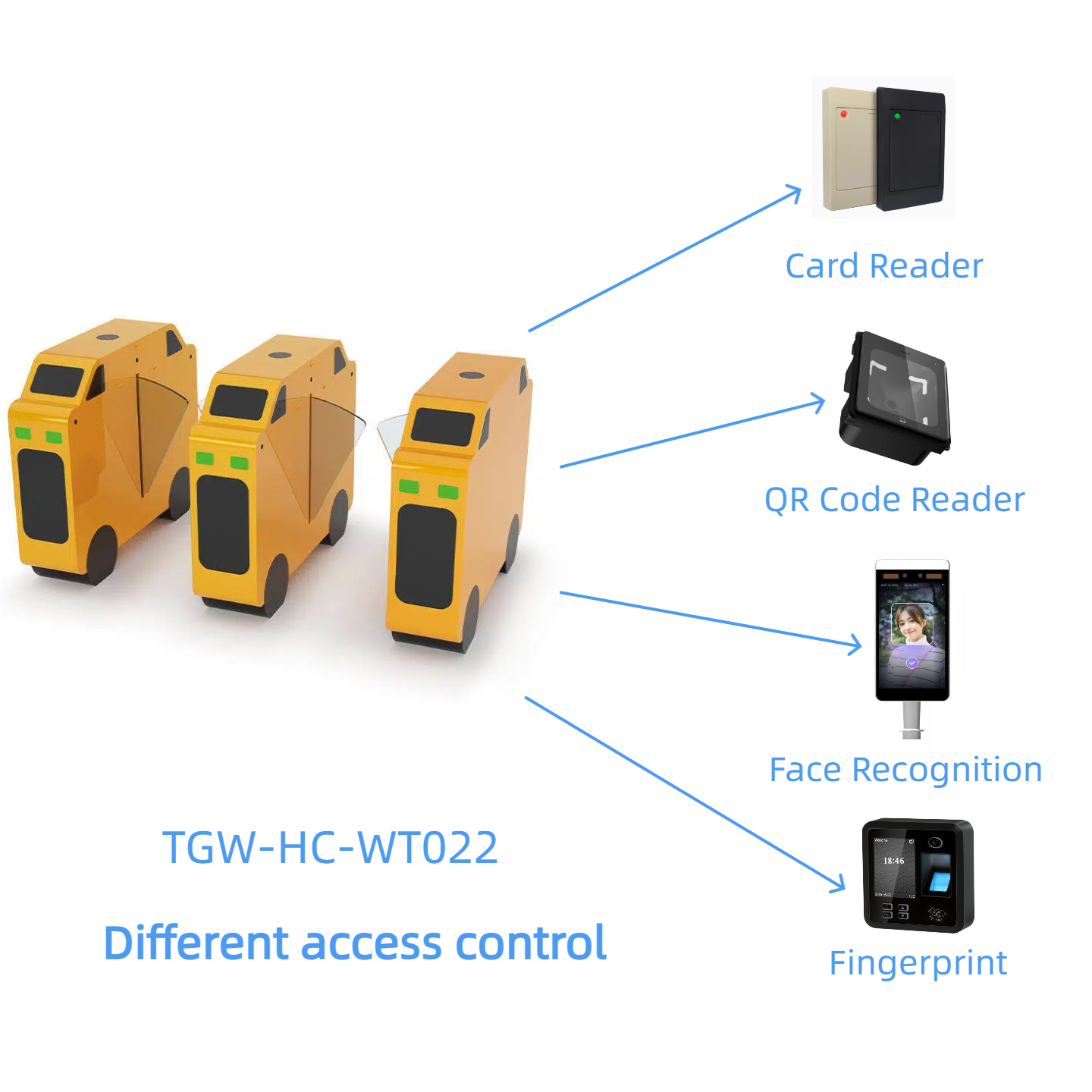 Each opening allows one person to pass through. It can be integrated with access control systems (e.g., RFID, fingerprint, face recognition) for automatic access management.